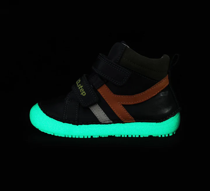Nuevos botas respetuosas de piel de D.D. Step en color azul marino oscuro (casi negro), el hilo para el cosido es de color azul. Las hemos llamado modelo LÍNEAS debido al diseño que tienen, en uno de los laterales lleva unas líneas en color naranja. Este modelo es fluorescente y brilla en la oscuridad, exactamente brilla la suela y para que brillen tiene que dejar que los zapatos estén un rato al sol.